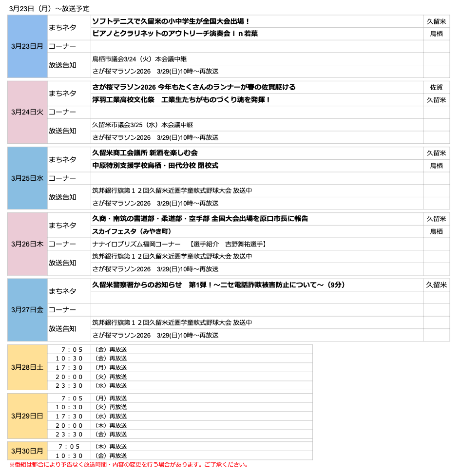 地域情報番組『くーみん・はっぴとすワイド』来週の放送予定